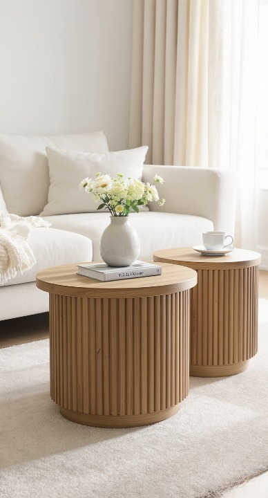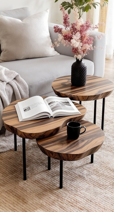 How gorgeous are these nested tables? The organic, swirling grain of the wood tops adds so much depth and character—it practically brings the outdoors in! The staggered heights and simple black legs create a dynamic, modern feel. You can pull them apart for extra surface area or keep them overlapped for a cool, layered look.