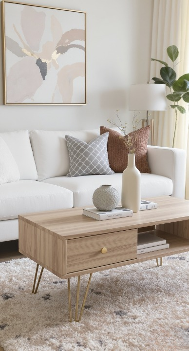 I love the sleek, clean lines of this rectangular wood table! The light wood finish and those cool, gold hairpin legs give it a definite Mid-Century modern flair. The drawer is handy for quick storage, and the open shelf below is ideal for stacking your favorite coffee table books. It’s light, bright, and totally stylish.
