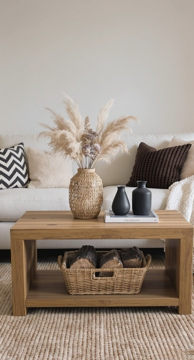 If you love a cozy, rustic look, this chunky wood table is for you! It’s solid, simple, and provides a great shelf underneath. Filling that space with a woven basket holding logs instantly adds warmth and texture. The natural wood tone and the dried pampas grass centerpiece really amplify that comfortable, earthy vibe.