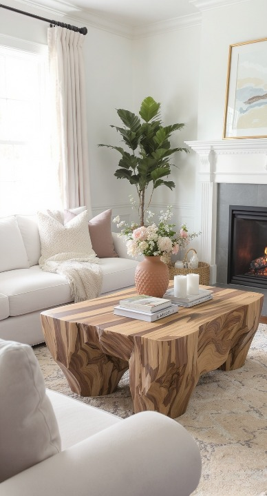 This table is truly a work of art! The raw, live-edge look and sculptural base of the wood make it the stunning focal point of the room. It brings a sophisticated, organic feel that perfectly contrasts the traditional fireplace and neutral decor. Talk about a showstopper that guests will definitely talk about!