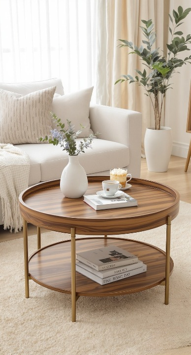 This classic round table with two tiers is wonderfully practical. The raised edge on the top helps keep items in place, and the lower shelf is great for display and storage. The rich wood tone and light gold legs give it a subtle, timeless elegance, making it a super versatile piece for any living room.