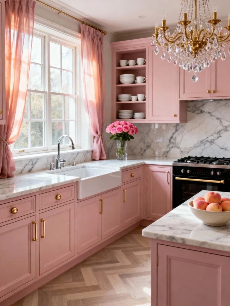 Can we talk about how soothing this is? This kitchen is the ultimate “good morning” space. The cabinetry is a beautiful dusty rose that feels more like a neutral than a bright pop of color. I love how the gold hardware and the crystal chandelier add that touch of “old world” elegance without making the room feel stiff.