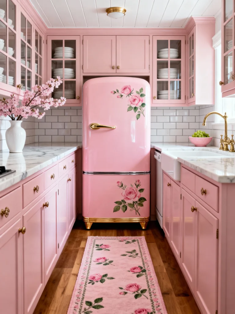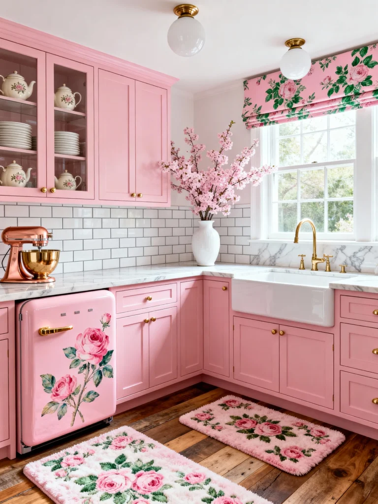 This kitchen is a total love letter to the rose. From the floral-patterned Roman shades to the matching rugs, it’s a maximalist dream. And can we talk about that pink Smeg-style fridge with the rose decal? It’s a total statement piece.