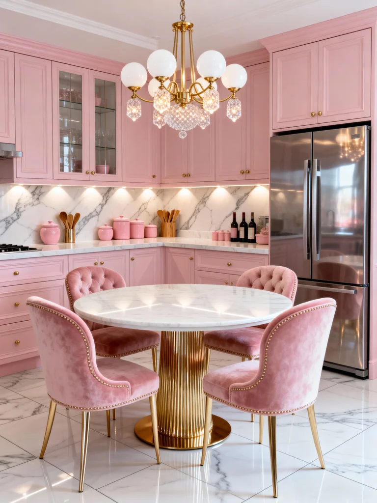 If you want your kitchen to feel like a high-end boutique hotel, this is your blueprint. We usually think of pink in terms of paint, but look at those chairs! The dusty pink velvet with the gold legs is such a vibe. It turns a simple breakfast nook into a focal point.