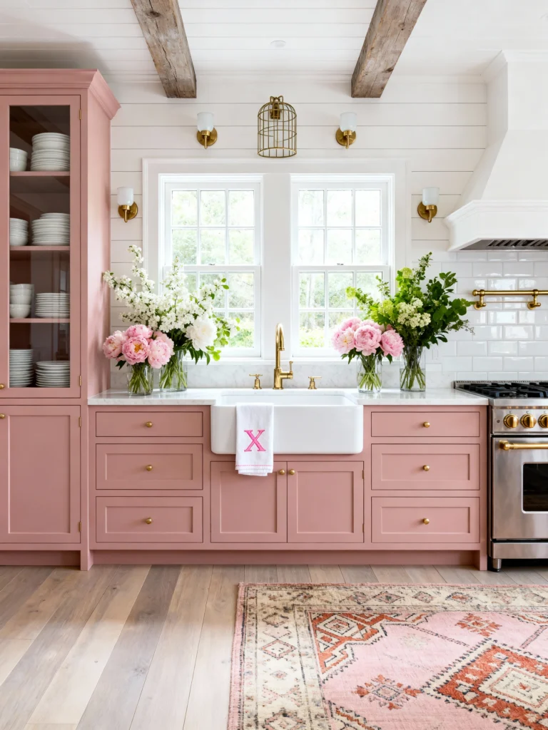 What I love most is the styling. The pink peonies and the patterned rug pull all the different shades of rose together. It feels like a kitchen where someone actually bakes pies and spends Sunday mornings reading the paper. It’s proof that pink can be incredibly grounded and “earthy.”