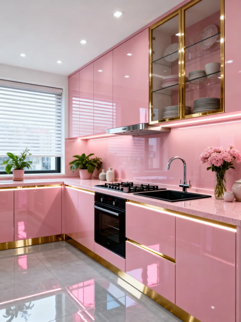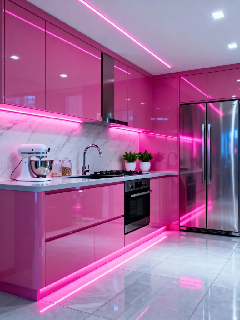 This kitchen is sleek, modern, and looks like something out of a futuristic penthouse. Instead of matte paint, we’ve got high-gloss pink cabinets that reflect the light beautifully.