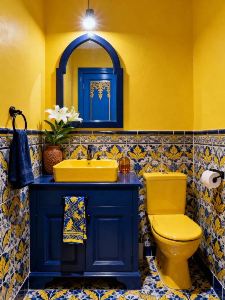 If you want to feel like royalty while getting ready in the morning, this is the blueprint. This space goes all-in on traditional Mediterranean patterns. What I love most is that they didn’t stop at the walls; they actually found a yellow toilet and sink! It sounds wild, but against that deep navy vanity and the arched mirror, it looks incredibly intentional and high-end. The gold filigree detail on the blue door in the reflection is that “chef’s kiss” finishing touch. It’s bold, it’s busy, and it’s absolutely beautiful.