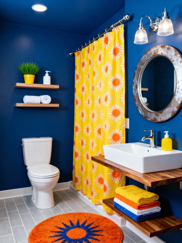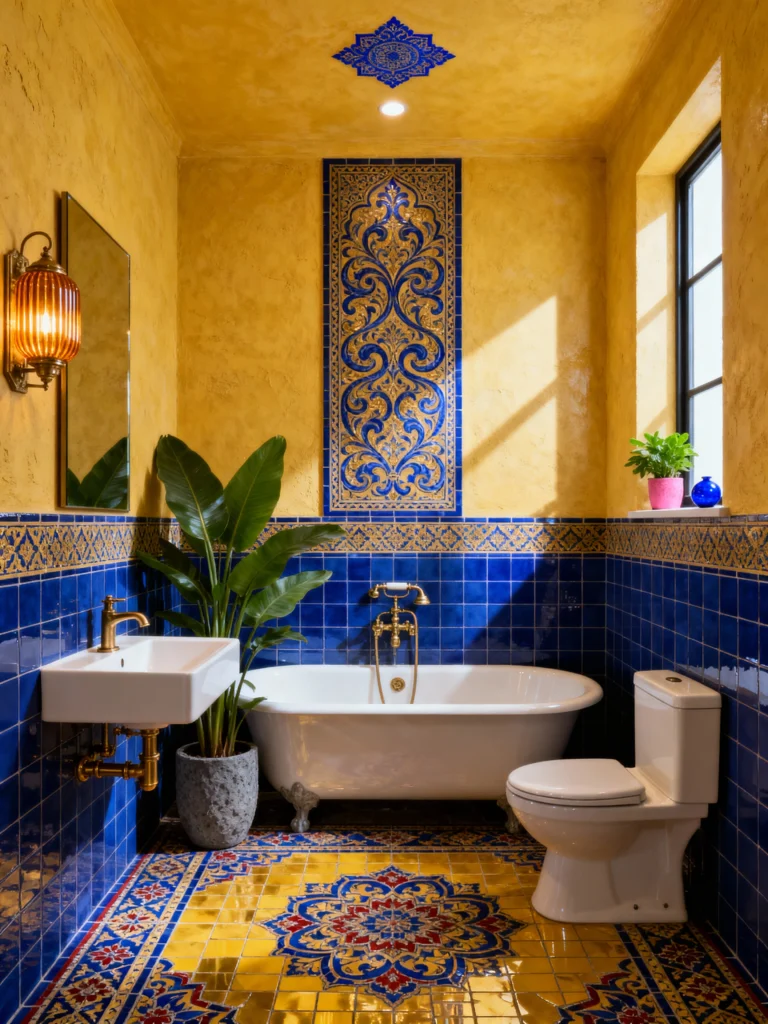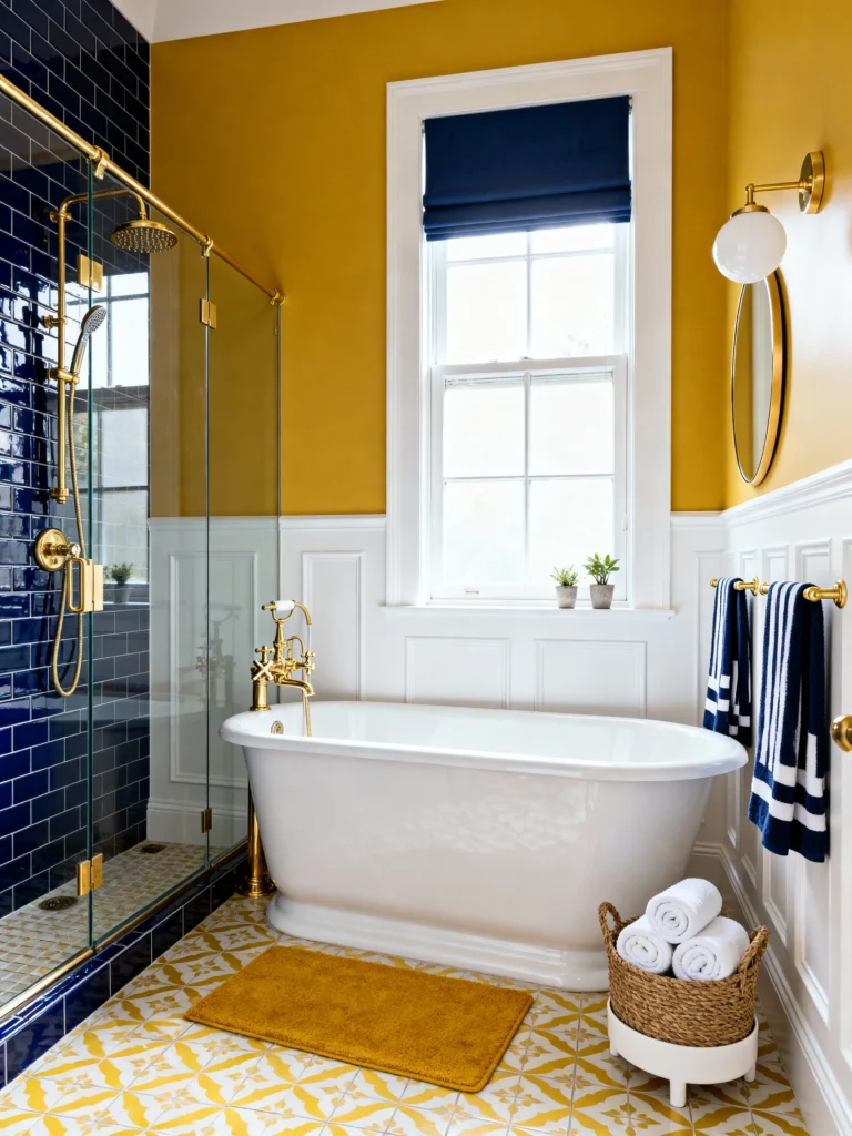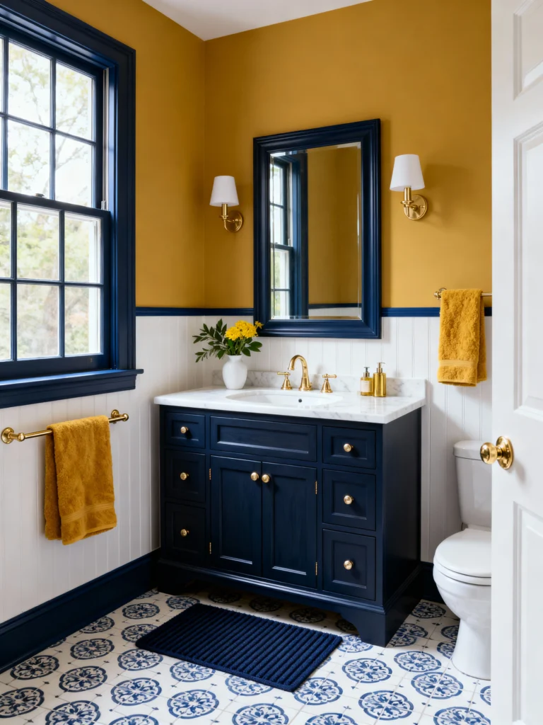 This is probably the most “livable” version of the trend if you’re a fan of traditional styles. The navy blue trim around the window and the matching vanity give the room a really cohesive, “designed” feel. That ochre-yellow wall color is warm and inviting without being neon. But the real star? The Mediterranean-style floor tiles. They add just enough pattern to keep things interesting without overwhelming the senses. It’s sophisticated, timeless, and just plain beautiful.
