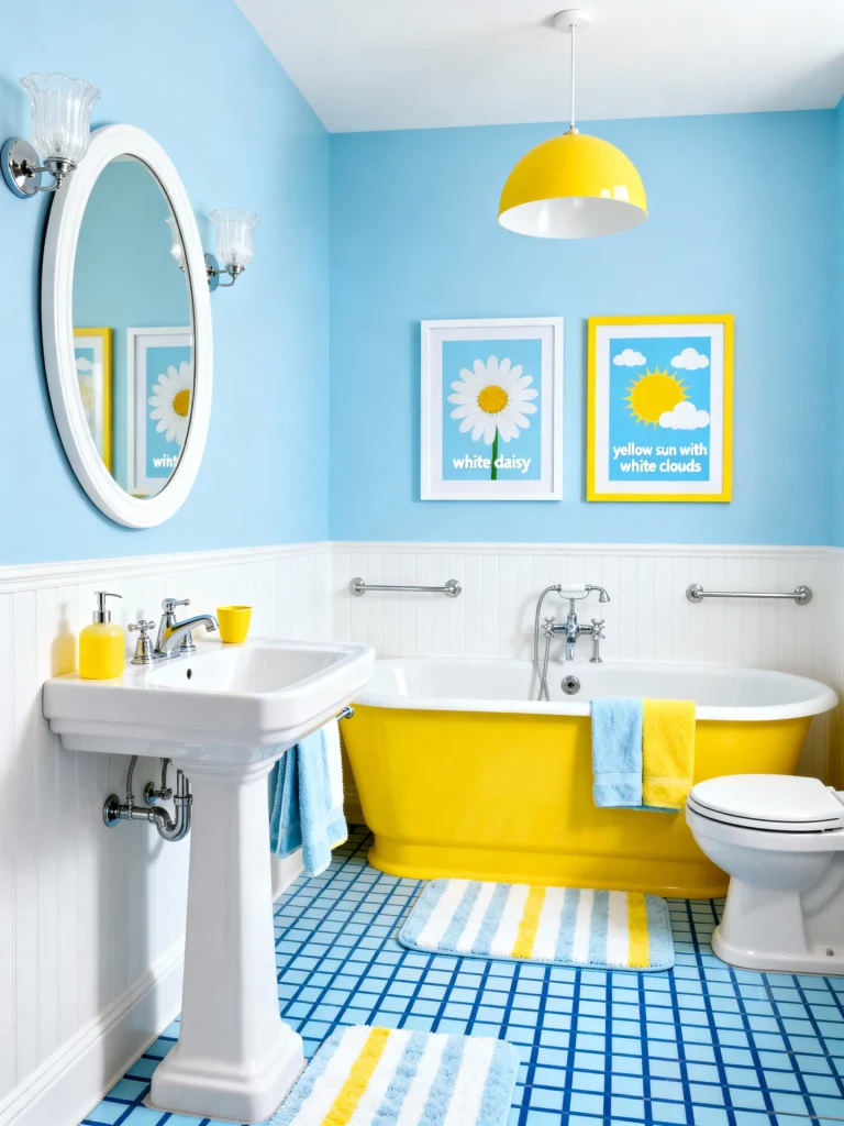 If the other bathrooms are a loud “hello!”, this one is a gentle “good morning.” By swapping cobalt for a soft sky blue, the room feels much airier. The pop of yellow comes from that gorgeous clawfoot tub. Seriously, who wouldn’t want to soak in a giant yellow lemon? The “White Daisy” and “Yellow Sun” artwork on the walls keeps the vibe playful and family-friendly. It proves that you can do a colorful bathroom without it feeling heavy or dark.
