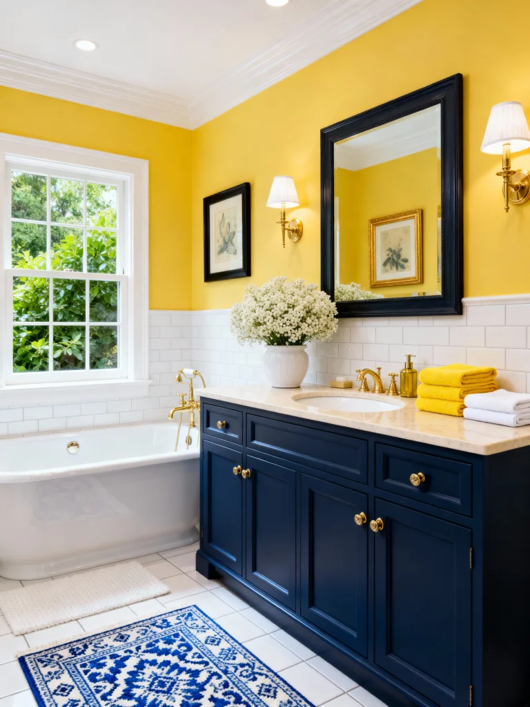 I am obsessed with the sophistication here. This is “Coastal Grandmother” meets “City Chic.” The navy blue vanity is super grounded and classic, especially with those gold knobs. By painting only the top half of the wall a soft marigold yellow and using white subway tiles on the bottom, the room stays bright and reflective. That blue and white patterned rug adds just enough texture to keep your feet happy on the cold tile.