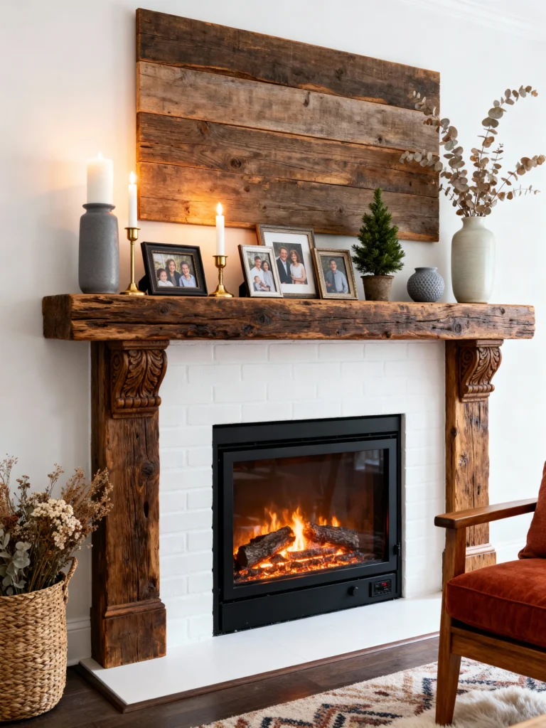 If you love the feeling of a farmhouse that’s been lived in for generations, this is it. This look is all about that massive, hand-carved wooden mantel. It has so much character—you can practically see the history in the grain. I love how the white brick keeps it feeling fresh and bright, rather than heavy. It’s the perfect stage for family photos and a few flickering candles. It’s simple, soulful, and feels like a big hug.