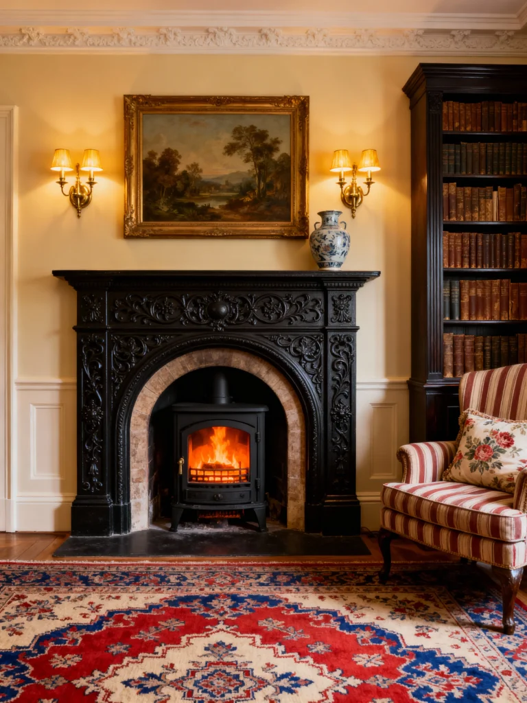 This is the ultimate “Christmas morning” vibe. The heavy stone goes all the way to the ceiling, and that thick, dark wood mantel is just begging for a wreath. I love the addition of the black wood-burning stove inside the hearth—it adds a touch of industrial charm to a very traditional room. It’s cozy, colorful, and makes me want to wrap myself in a green blanket and never leave.
