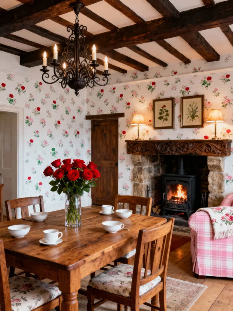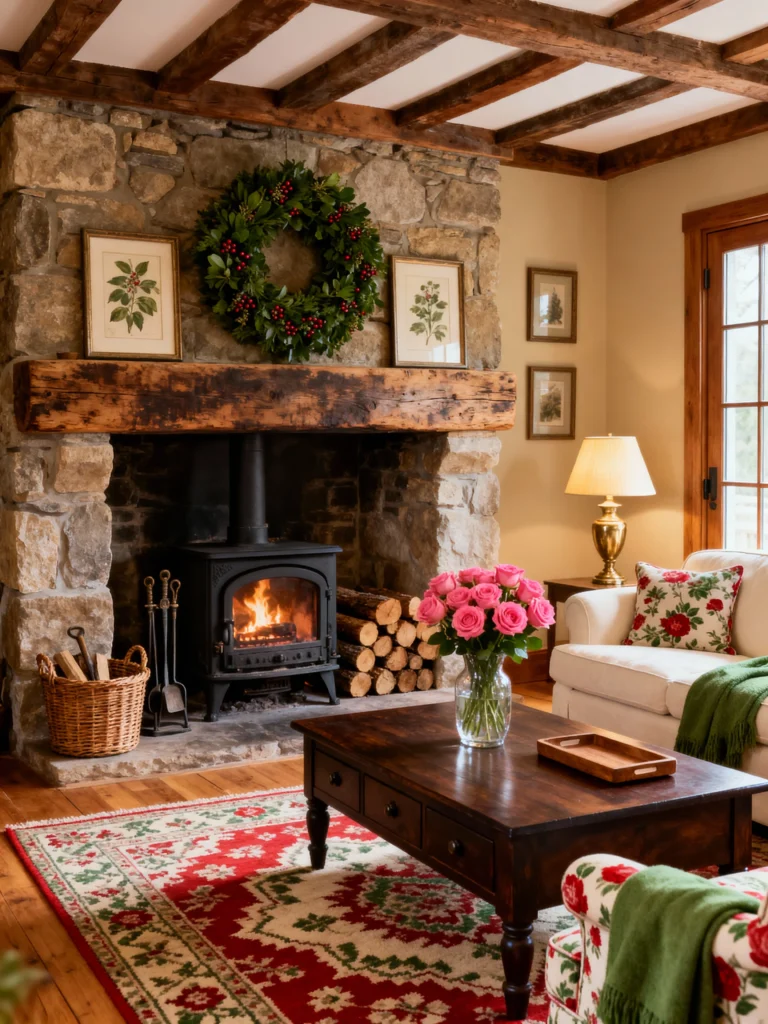 This room is pure joy. The floral wallpaper combined with the wood-beamed ceiling gives me major English countryside vibes. It’s proof that you don’t have to stick to neutrals to have a beautiful fireplace area. The red roses on the table perfectly pick up the tones in the wallpaper, making the whole room feel like a cohesive, blooming garden.