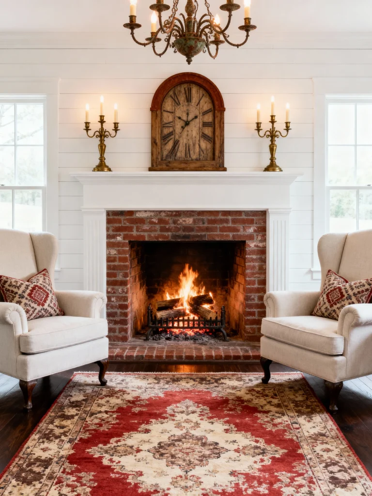 This one is for the lovers of symmetry and classic style. The crisp white mantel against the red brick is such a “New England” look. What really makes this work is the oversized wooden clock and those vintage brass candelabras. It feels sophisticated but totally approachable. Imagine sitting in one of those wingback chairs with a cup of tea while the snow falls outside. It’s elegant without trying too hard.