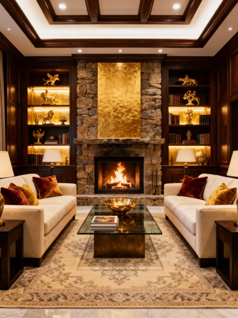 Okay, can we talk about that gold accent? This is pure luxury. If you want your living room to feel like a high-end library or a private club, this is your blueprint. The combination of the rugged stone fireplace and that shimmering gold panel above the mantel is genius. It’s a mix of “earthy” and “expensive.” With the dark wood built-ins and the warm backlighting, this room feels like it belongs in a movie.
