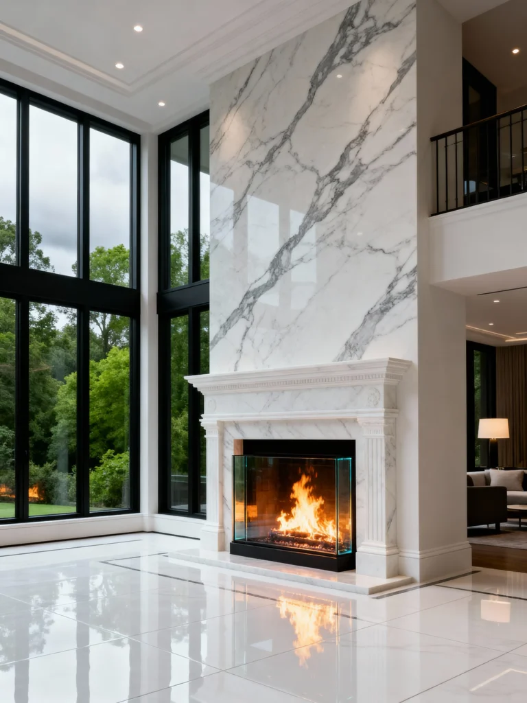 If “minimalist but massive” is your vibe, look no further. This floor-to-ceiling book-matched marble is absolutely stunning. It plays off the huge windows and high ceilings perfectly. Because the marble is so light, it doesn’t feel imposing; it feels airy and expensive. The glass-enclosed firebox keeps it looking modern and clean. It’s less of a fireplace and more of a piece of fine art.