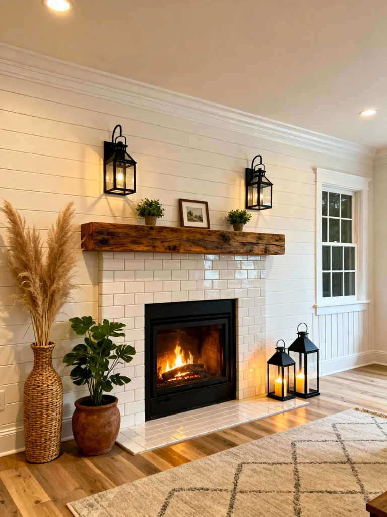There’s something so calming about horizontal shiplap. This fireplace is a masterclass in textures: you’ve got the smooth wood walls, the glossy subway tile around the hearth, and that chunky reclaimed wood mantel. Those black lantern sconces are the perfect finishing touch. It’s a very “modern coastal” look that feels light, bright, and incredibly organized.