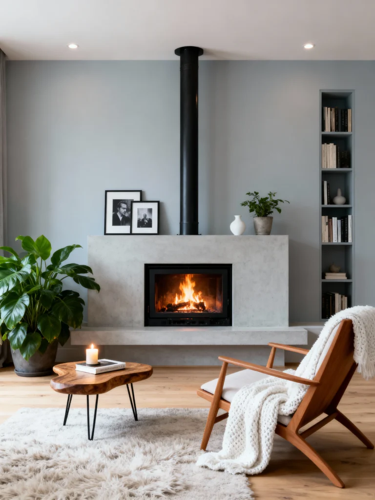This is for the person who hates clutter. The smooth, grey concrete-style surround is so chic and understated. I love the exposed black flue pipe—it gives it a bit of a loft/industrial edge. The built-in vertical bookshelf to the side is a clever way to add interest without taking up floor space. It’s cool, calm, and perfectly curated.