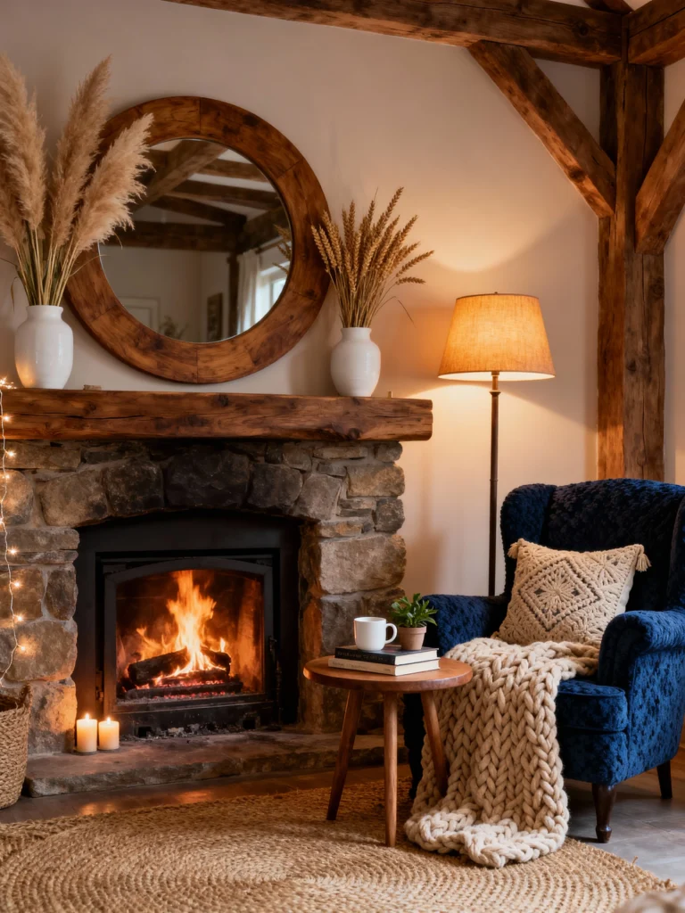 This image is the definition of hygge. The round wooden mirror reflects the warm light from the floor lamp, and the stone fireplace feels so sturdy and grounded. That deep blue velvet chair paired with the chunky knit throw is the perfect place to get lost in a book. It’s a small, intimate setup that proves you don’t need a giant room to have a spectacular fireplace.