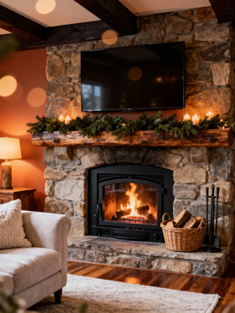 This is the perfect compromise for a family room. You get the beautiful, natural stone and the rustic log mantel, but you still have the TV mounted right where everyone can see it. The evergreen garland and the candles make it feel so festive and warm. It feels like a high-end ski resort lodge where you can kick your boots off and relax in style.