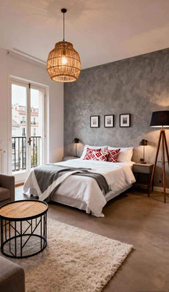 Isn’t this space cool? It perfectly balances that raw, industrial look—hello, concrete ceiling and walls!—with cozy, earthy textures. The huge woven pendant light is a total showstopper, bringing a beautiful, warm glow that softens the hard edges. I love how they’ve carved out a snug bedroom nook against the textured grey wall. The rich wood cabinets and the pop of burnt orange on those pillows add so much warmth and contrast. Plus, having that balcony access right there? Perfect for letting in the breeze. It feels like a chic city loft that’s also totally inviting.