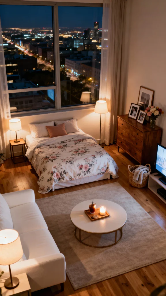 Here’s a space that feels instantly welcoming and homey—it’s Homey Glow. The warm lighting and the soft floral duvet create a very gentle, relaxed atmosphere. The traditional wooden dresser adds a classic touch, contrasting nicely with the modern white coffee table. It’s a wonderful, complete studio setup that feels inviting and personal, with that beautiful night view as the perfect backdrop.