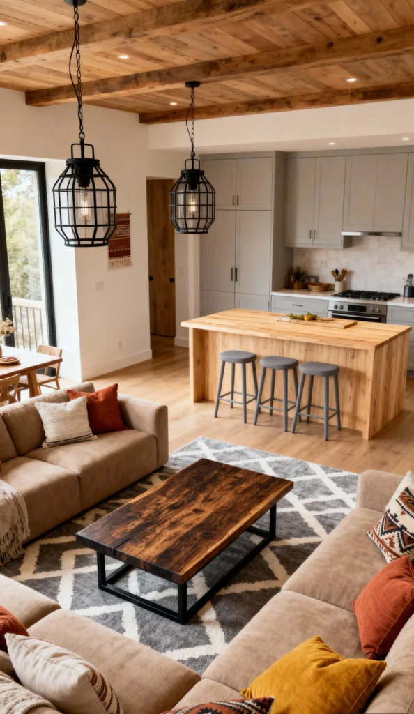 Okay, if I had a cabin, this is what I’d want it to look like! That beamed wood ceiling and the light wood kitchen island bring in such a wonderful, rustic texture. But check out how they keep it modern with those sleek, light grey cabinets and the cool, cage-style pendant lights. The living area looks so inviting with the sectional sofas and that gorgeous, live-edge wood coffee table. And the rug? It ties the whole space together with its geometric pattern, grounding the room in a cozy, stylish way. It’s the perfect spot for relaxing after a long day!