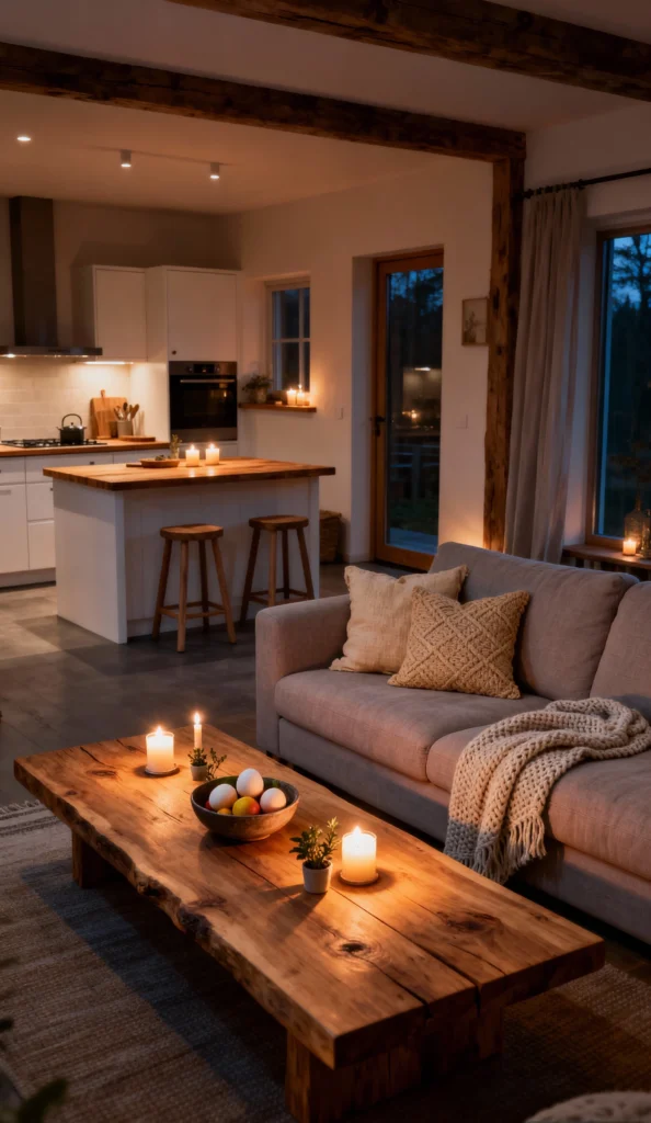 This image is the definition of Rustic Warmth. Seriously, look at this place! The exposed wood beams and the chunky live-edge coffee table bring such a cozy, cabin-like feel right into the living area. The open-plan kitchen looks amazing with that bright white cabinetry contrasting the wood accents. And those candles? They’re casting the perfect golden glow, making it feel like the ultimate spot to unwind with a good book. It’s the perfect blend of modern convenience and rustic charm.