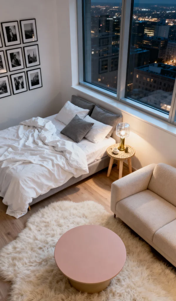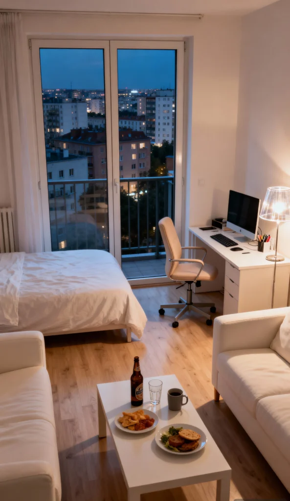 This apartment feels so real and comfy—it’s Compact Comfort. It’s a great example of maximizing a smaller space, fitting a bed, desk, and living area all near that large balcony door. The lighting is soft and warm, making the white furniture and light wood floor feel super inviting. Plus, someone’s ready for a relaxed evening with a sandwich and a beer on the coffee table. It proves you don’t need a huge place to create a cozy, functional home!