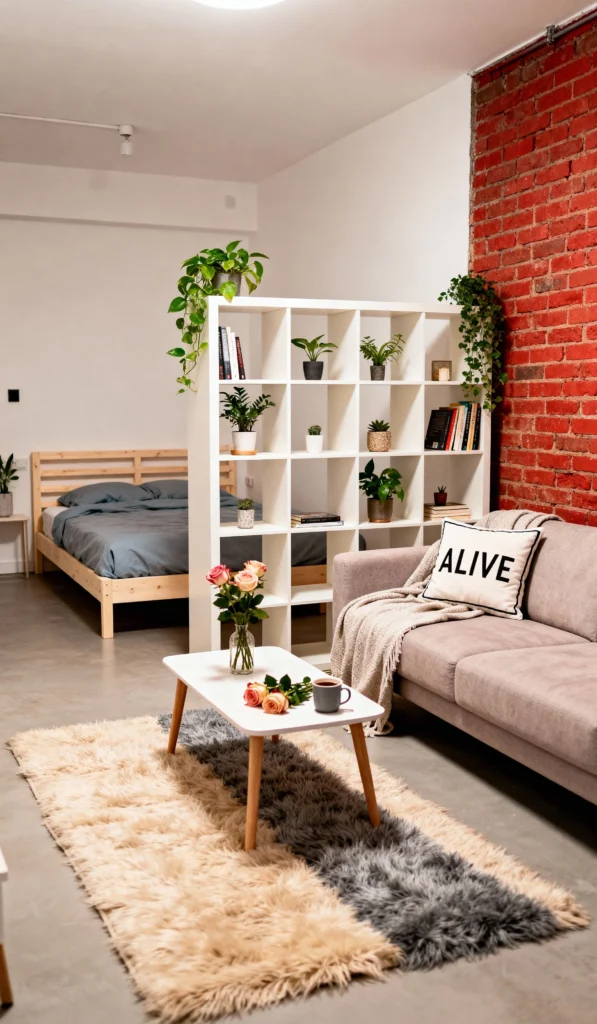 I love how clever this layout is—it’s all about Smart Separation. Using a large, open-shelved unit as a room divider is genius for defining the sleeping and living areas without blocking light or flow. The exposed brick wall adds a fantastic industrial texture, while the plush shag rug and lots of greenery soften the whole look. It’s a stylish and practical way to live in a studio apartment.
