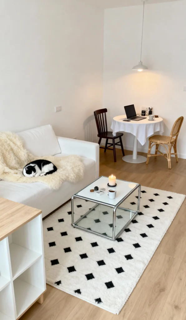 This is such a charming, Monochrome Retreat. The clean white walls and sofa are beautifully offset by the bold black and white geometric rug. The mix of a modern glass coffee table and a rustic rattan chair creates a really interesting texture. And honestly, the cat napping on the fuzzy throw is the ultimate sign of a truly cozy home! It feels effortlessly stylish and peaceful.