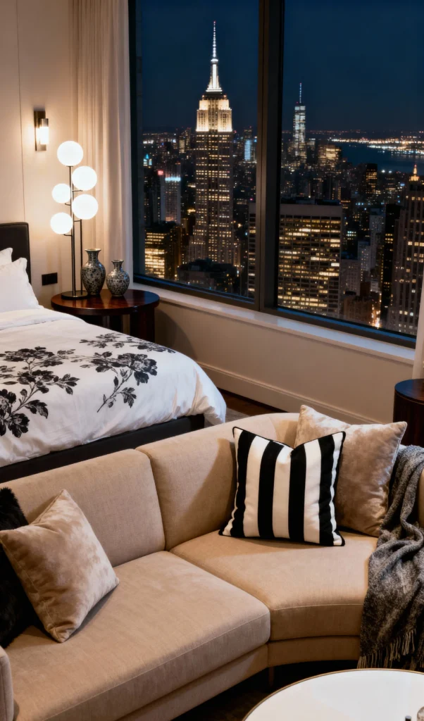 This one just screams City Glamour. That floor-to-ceiling window showcasing the New York skyline is a showstopper. The bedroom is so chic with the black and white floral bedding, and the sectional sofa with the bold striped pillow invites you to just sit and stare out at the lights. It feels luxurious, modern, and incredibly romantic, especially at night. Imagine waking up to that view every morning!