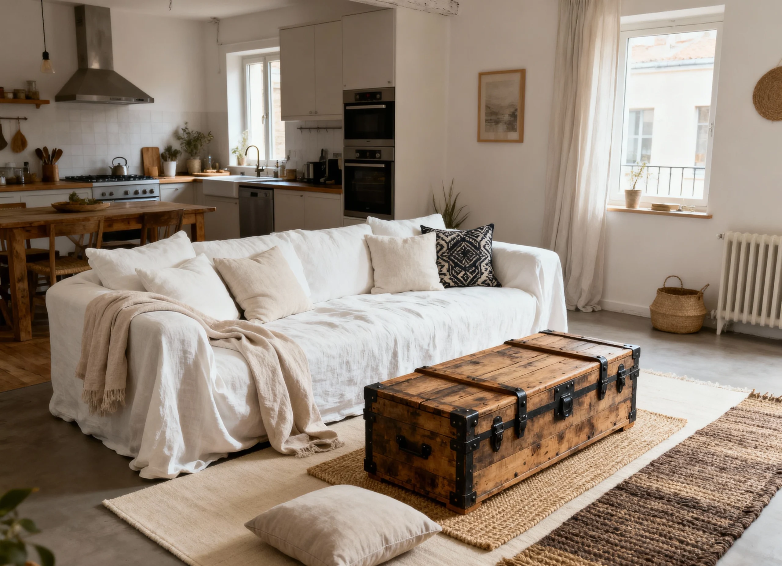 This image is the definition of Rustic Warmth. Seriously, look at this place! The exposed wood beams and the chunky live-edge coffee table bring such a cozy, cabin-like feel right into the living area. The open-plan kitchen looks amazing with that bright white cabinetry contrasting the wood accents. And those candles? They’re casting the perfect golden glow, making it feel like the ultimate spot to unwind with a good book. It’s the perfect blend of modern convenience and rustic charm.
