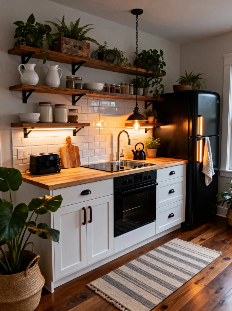 If you’re a fan of that “perfectly lived-in” look, this first kitchen is going to be your new obsession. It’s got this incredible balance of industrial edge and rustic warmth. Notice the black appliances—the fridge and toaster—against those crisp white cabinets? It’s such a sharp, modern contrast, but it doesn’t feel cold. Why? Because of those gorgeous butcher block countertops and the open wooden shelving.