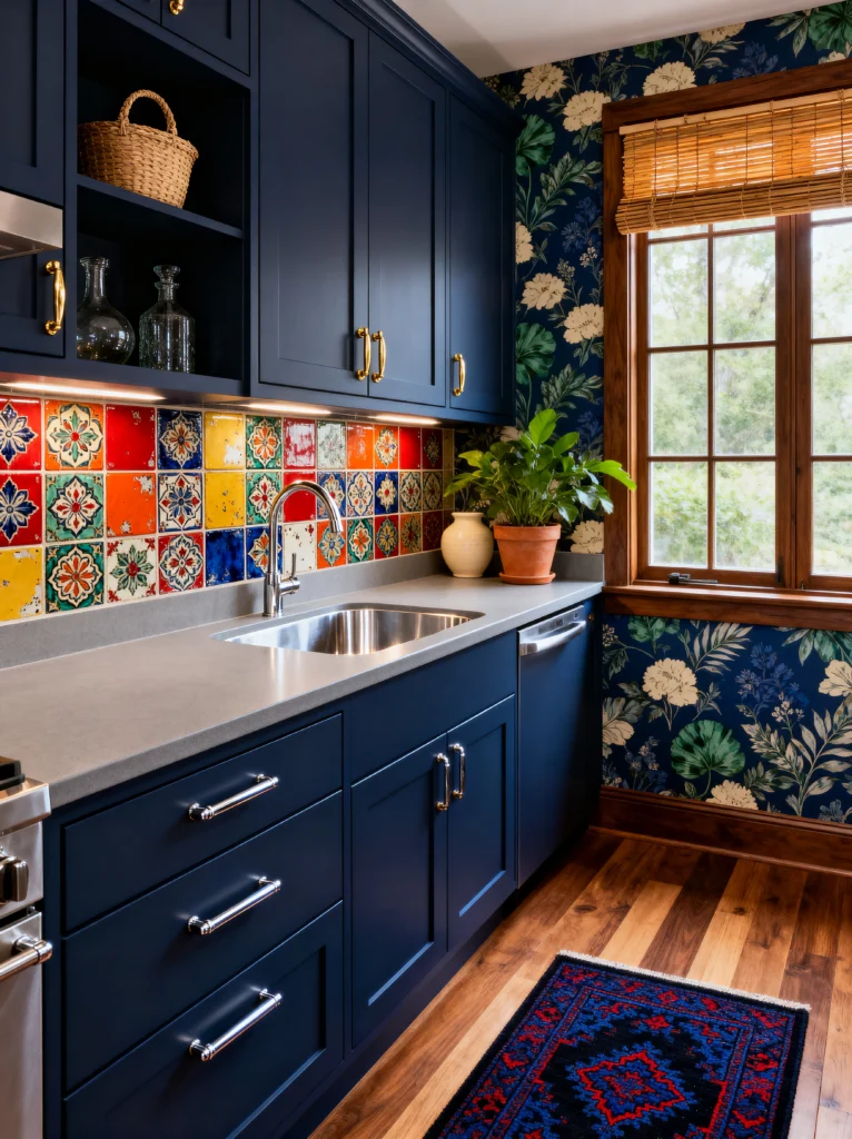 This kitchen is for the brave! We’re calling this one Tiled Texture. It takes that deep navy cabinet trend we saw earlier and cranks the volume up to eleven with a multi-colored, Spanish-style tile backsplash. Every tile is different, creating a mosaic of reds, yellows, and blues that acts as the focal point of the entire room.