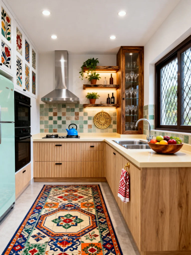 This kitchen is such a cool mix of Retro Fusion. You’ve got these beautiful, vertical-slatted light wood cabinets that feel very “Mid-Century Modern,” paired with a mint green Smeg-style fridge that adds a touch of 50s nostalgia. But then, look down! The floor features a massive, intricate tile “rug” that brings in a traditional Mediterranean feel.