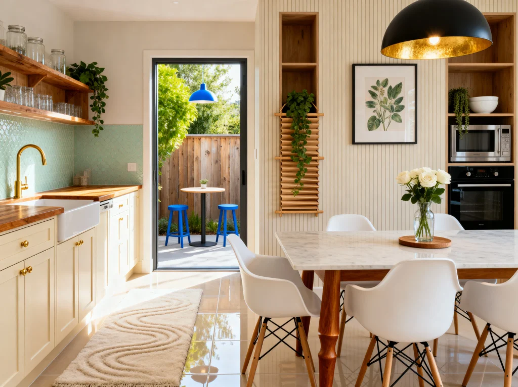 The layout is what really shines here. The indoor kitchen flows seamlessly into a little outdoor patio with bright blue stools, making the whole space feel much larger. Inside, the white Eames-style chairs and the marble-topped table give off a “Scandinavian Modern” vibe. I love the clever use of vertical space, like the recessed wall shelving for the microwave and decor. It’s a clutter-free zone that still feels welcoming thanks to the soft textures, like the wavy-patterned runner on the floor and the fresh white roses on the table. It’s the perfect “reset” space.