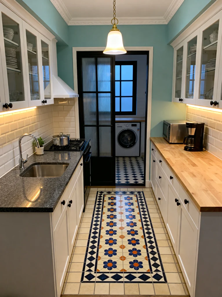 This galley kitchen is proof that narrow spaces can be high-impact. It’s giving me modern-meets-vintage vibes in the best way possible. That teal accent wall at the far end is such a smart trick; it draws your eye through the space, making it feel longer and more architectural. And let’s talk about that floor! The patterned tile “runner” built right into the flooring is a total showstopper. It adds so much character without the trip hazard of a real rug.