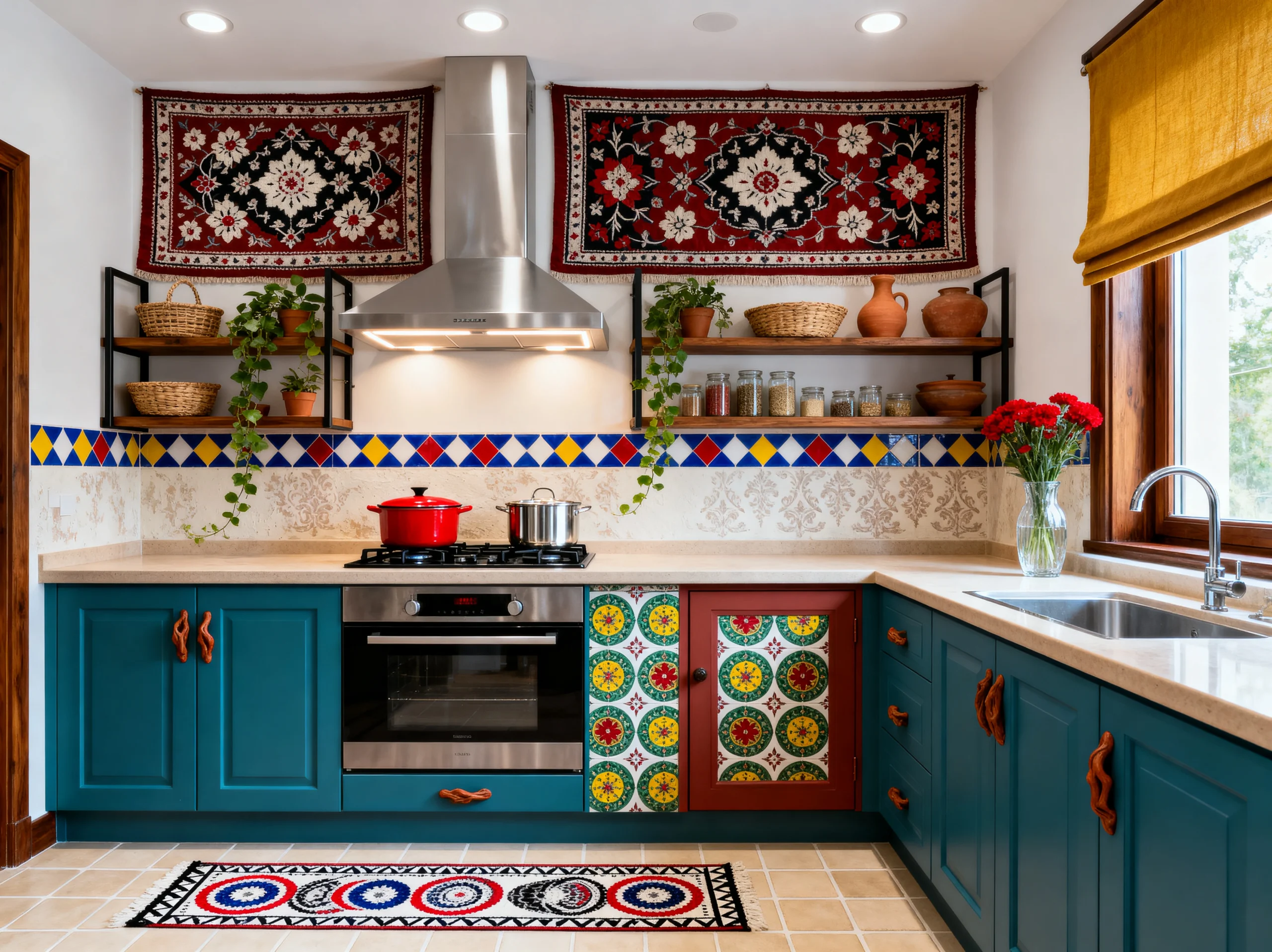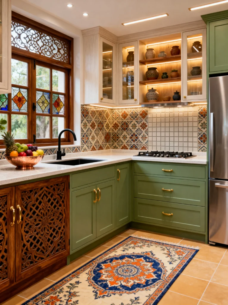 The backsplash here is a mix of patterned tiles and simple squares, which is a great way to define different zones of the kitchen. But the real star might be that window. The stained glass and the intricate woodwork above it make the view outside feel like a framed painting. Topping it off with a plush Persian-style rug makes the kitchen feel less like a “work zone” and more like a furnished room you actually want to hang out in. It’s elegant, earthy, and totally timeless.