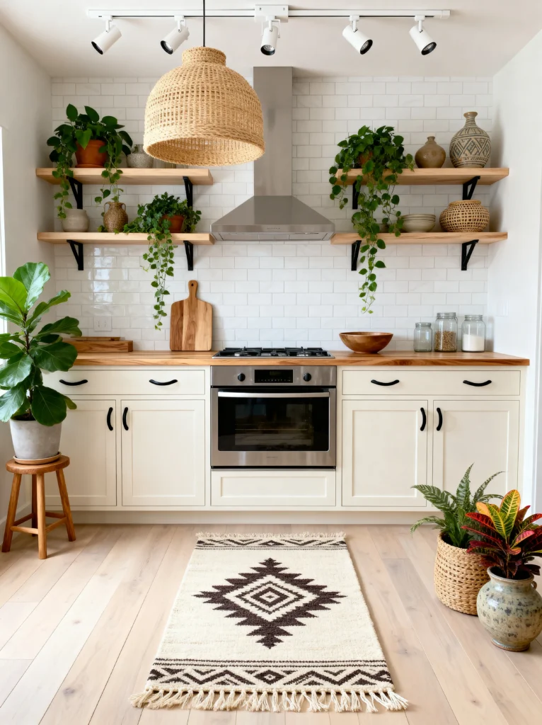 If your goal is “bright, airy, and Zen,” this is the one for you. This kitchen is all about texture over color. By sticking to a palette of white, cream, and light wood, the focus shifts to the materials—the oversized wicker pendant light, the woven baskets, and the fringe on the rug. It feels incredibly fresh and breathable.