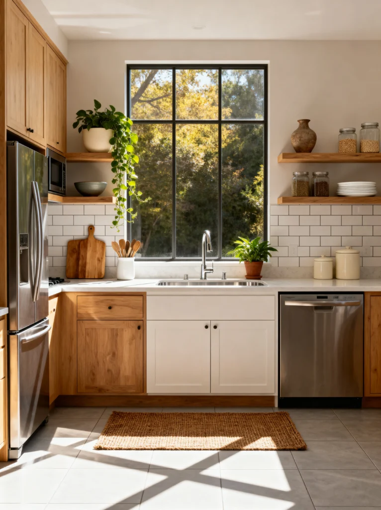 I love the mix-and-match approach here—white cabinets under the sink and wood everywhere else. It breaks up the visual weight and makes the sink area feel like a focal point. The jute rug on the floor is a practical choice for a kitchen since it’s durable, but it also adds that necessary bit of “rough” texture to balance the smooth countertops. This kitchen doesn’t try too hard; it’s just simple, high-quality materials working together to create a space that feels calm and incredibly welcoming.