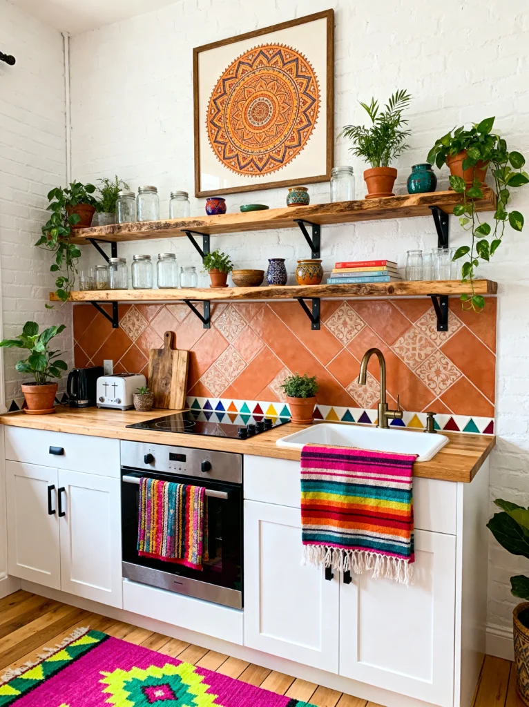 This kitchen is a masterclass in Eclectic Bohemian style. What I love most is that it doesn’t take itself too seriously. Look at that backsplash—it’s a terracotta-colored tile set on a diagonal, topped off with a playful row of colorful geometric triangles. It’s unexpected, and it works perfectly with the rustic, live-edge floating shelves.