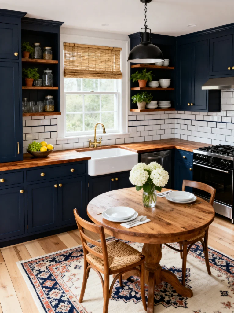 This kitchen is all about Navy Elegance. Dark cabinets can sometimes feel heavy, but the designer here used a clever trick: they balanced the deep navy with a crisp white subway tile backsplash and light-toned wood floors. The result? A space that feels intimate and cozy rather than dark and cramped.