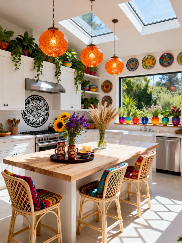 The style leans into “Global Chic.” You’ve got the monochrome mandala behind the stove, the colorful Mexican-style pottery on the window sill, and those woven rattan barstools with vibrant cushions. It’s proof that you can have a white kitchen (the cabinets and walls are neutral) while still having a ton of color. The greenery draped over the top cabinets makes the room feel like an indoor garden. It’s a space designed for long brunches and late-night chats over a bottle of wine.