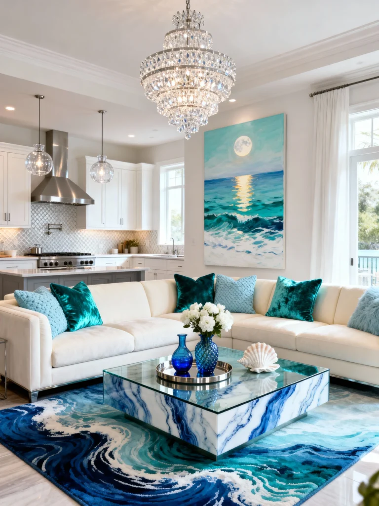 Notice how the rug mimics the movement of crashing waves? It pulls the eye downward, making the room feel grounded. To balance all that deep blue, the designer added a massive crystal chandelier that reflects light like sun shimmering on the water. It’s the perfect mix of “glam” and “maritime.”