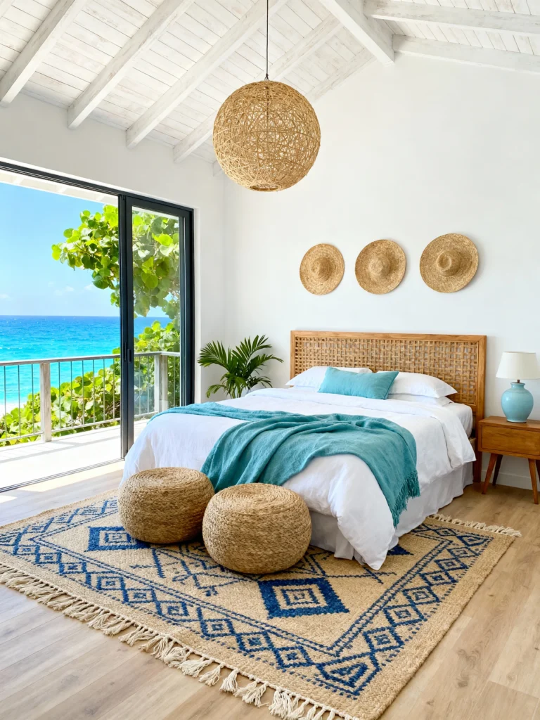 The woven headboard and the trio of straw hats on the wall add a “vacation-ready” vibe. By keeping the bedding mostly white and just adding a single teal throw, the room feels clean, bright, and perfectly balanced against the bright blue ocean outside.