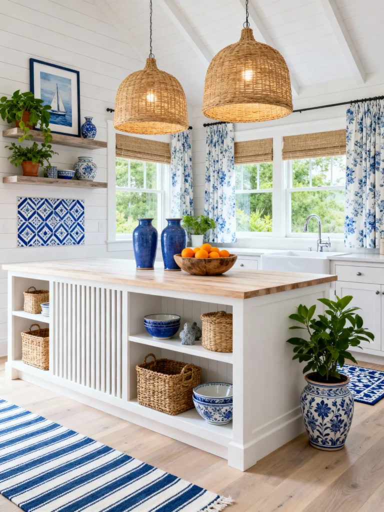 What I love most here is the layering of textures. You’ve got the heavy, woven rattan pendant lights hanging from the vaulted ceiling, which ground the room, and then those pops of Mediterranean blue in the tiles and the oversized ginger jars. It’s a perfect mix of “refined” and “ready for a barefoot breakfast.” Those floral curtains add a touch of softness that keeps the straight lines of the cabinetry from feeling too clinical. It’s the kind of kitchen where you actually want to do the dishes because the view (and the vibe) is just that good.