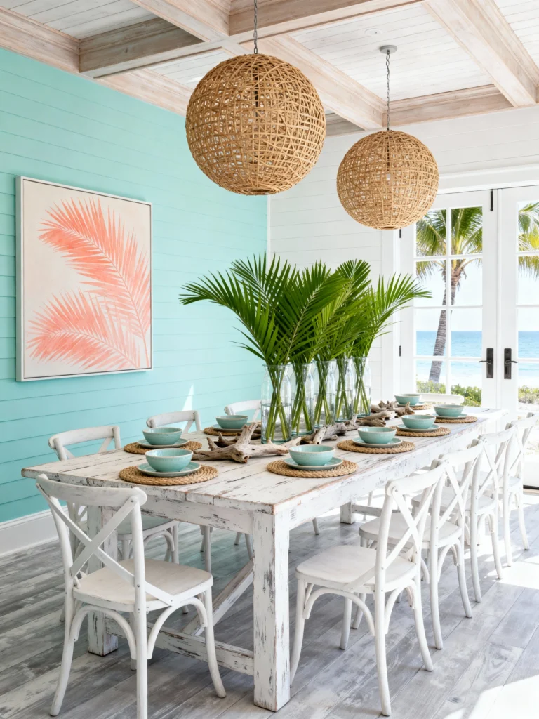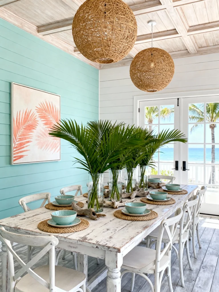 If you want a dining room that feels like a party, look no further. The mint-teal shiplap accent wall is a bold choice that pays off. It makes the white “X-back” chairs pop and provides a stunning backdrop for that oversized palm leaf artwork.