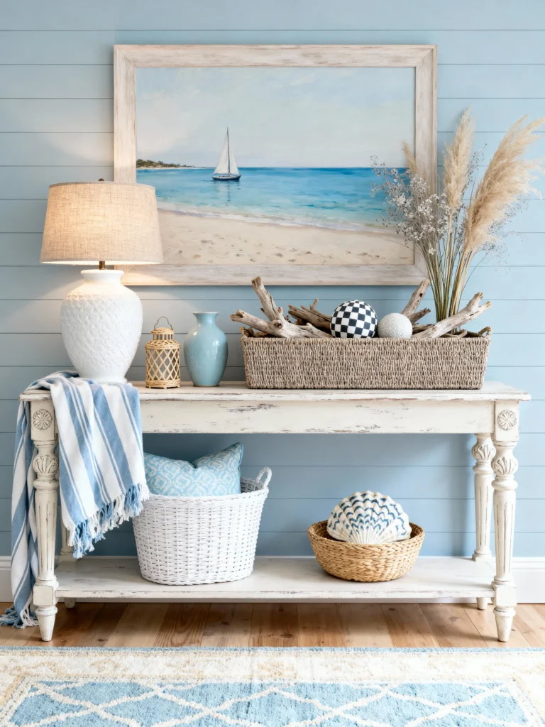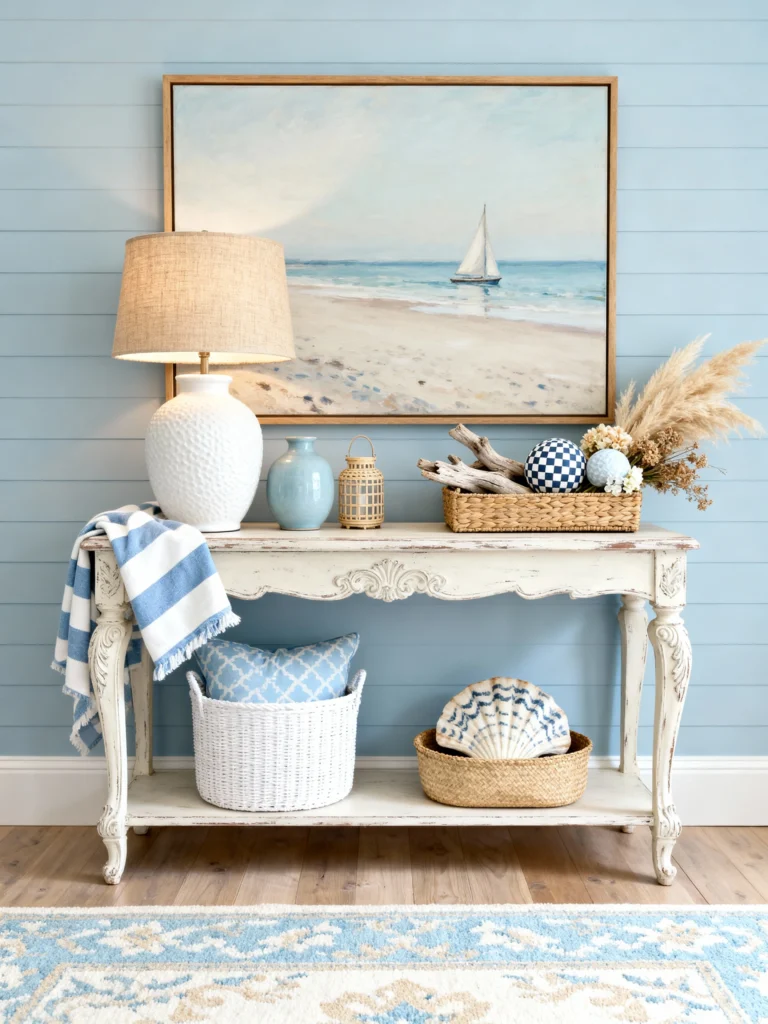 If you have an empty hallway or an entryway that feels a bit “blah,” this is your blueprint. This vignette is all about serenity. The soft dusty-blue shiplap creates a calm backdrop for a classic, slightly distressed console table.