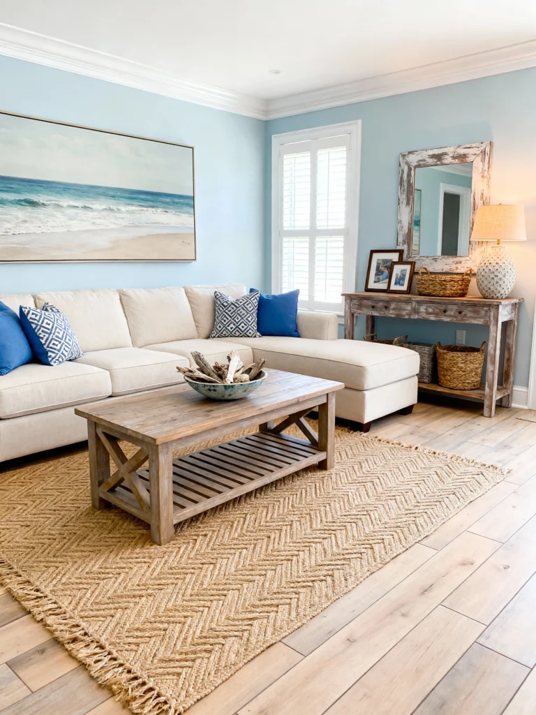 I’m a huge fan of the natural jute rug here—it adds that essential “crunchy” texture that every coastal room needs. It contrasts beautifully with the smooth, light wood floors. Also, check out the coffee table; it’s sturdy and rustic, perfect for kicking up your feet. The light blue walls keep the whole room feeling expansive, like you’re sitting inside a cloud. It’s sophisticated enough for guests but cozy enough for a Netflix marathon.